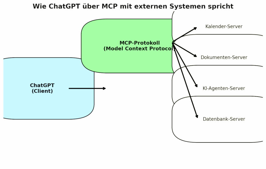 Beispiel: ChatGPT muss einen Termin im Kalender suchen. Statt die Google- oder Outlook-API einzeln zu kennen, fragt ChatGPT über MCP einfach den Kalender-Server ab. Ergebnis: schneller, standardisierter Zugriff.